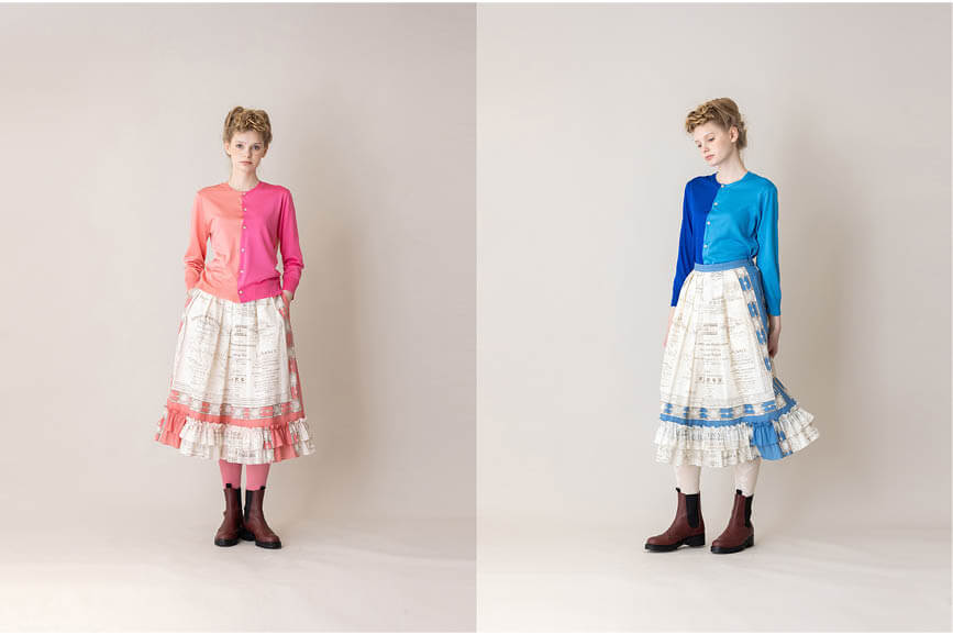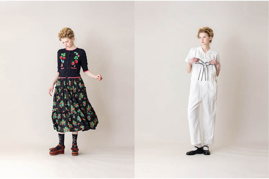 村野 私の根底には、クラシカルでトラディショナルなものがあって、それらを打ち破っていくような場面もあれば、清潔感や品格やインテリジェンスを大切にする側面もあります。服作りは視覚的なものはありますが、精神的なものもすごく大事にしたいという思いがいつもどこかにあって、私にとっては譲れない部分でもあります。服を着た人がしあわせになるものでありたいという気持ちが私のなかにはあって、そのなかからいろいろつくっていけばいいというような、当初は漠然とした考えだったと思います。具体的な部分をひとつあげるとしたら、イギリスの寄宿舎の制服のようなトラディショナルなスタイルが好きでしたから、それらの要素をジェーンマープルなりにかたちにすればよいのかなという気持ちもありました。